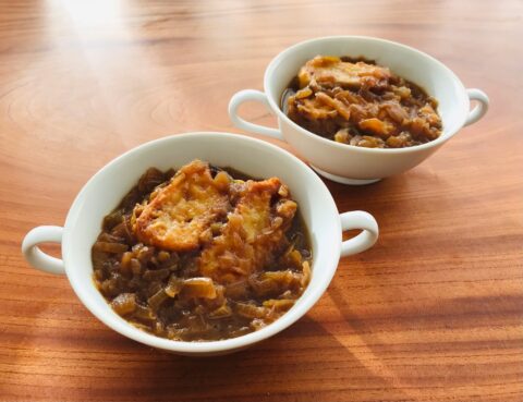 朝晩が寒くなってきた。オニオングラタンスープが飲みたい、早起きして玉ねぎ4個を弱火でじっくりと炒める。根気よく1時間位炒める。焦げを玉ねぎの水分でこそげ落とす。それを繰り返し、塩、こしょう、コニャックで風味付け。バゲットにチーズをのせ、こんがり美味しそうな焼き色がつくまで焼いておく。スープ皿にバゲットをのせ、熱々のスープを注ぐ。時間をかけただけ贅沢な味わいが待っている。