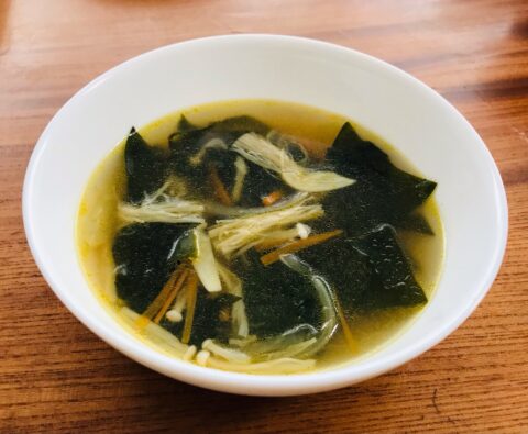 玉ねぎはスライス。人参は千切り。えのきは、いしづきを取り5cm長さにカットし、ほぐしておく。鍋に胡麻油を入れ加熱する。ニンニクを加え焦がさない様に炒める。玉ねぎ、人参、えのき、わかめを加え炒める。(わかめも炒める事でコク、味わい深くなります)野菜類がすこし透明になったら酒を加え煮詰める。水または、鶏がらスープを加え一煮立ちしたら味付けして完成です。