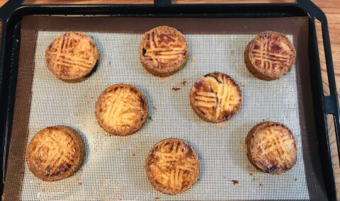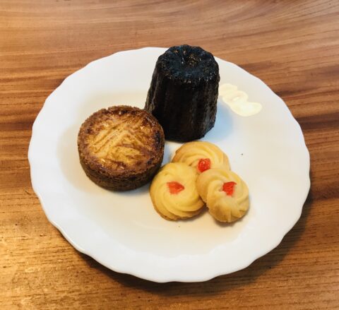 焼き菓子3種類 ガレットブルトンヌ、ヴィエノワ、紅茶のカヌレ 2026 1/13 料理 2026.1.112026.1.13 サブレは、ドレンチェリーをのせてレトロに。ガレットブルトンヌは、塩味を効かせて中に赤ワインで煮たプルーンをサンド、カヌレは紅茶味でカリッと仕上げる。 料理 コック・オ・ヴァン
